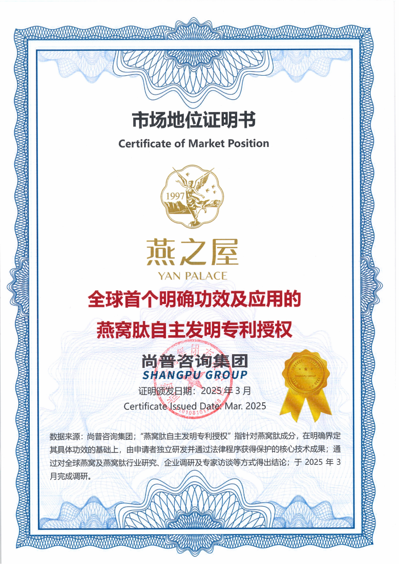 燕之屋多年來致力于燕窩肽研發(fā)與應(yīng)用,于2022年正式成立燕窩肽研究中心,開辟品牌在燕窩肽酶解技術(shù)、活性成分與功能研究的新賽道,多項研究成果刊登于國際權(quán)威期刊。2024年,燕之屋自主研發(fā)的“一種具有促進(jìn)細(xì)胞修復(fù)、高保濕美白功效的燕窩肽制備方法及應(yīng)用”榮獲國家知識產(chǎn)權(quán)局授權(quán)發(fā)明專利⑥。經(jīng)權(quán)威機(jī)構(gòu)尚普咨詢集團(tuán)專業(yè)認(rèn)證,燕之屋更獲得“全球首個明確功效及應(yīng)用的燕窩肽自主發(fā)明專利授權(quán)”④市場地位證明書,進(jìn)一步驗證該專利的引領(lǐng)地位,夯實燕之屋在燕窩肽技術(shù)領(lǐng)域的引領(lǐng)者身份。