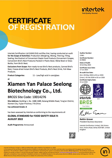 圖:燕之屋獲得BRC食品安全全球標(biāo)準(zhǔn)、IFS國際食品標(biāo)準(zhǔn)雙重認(rèn)證